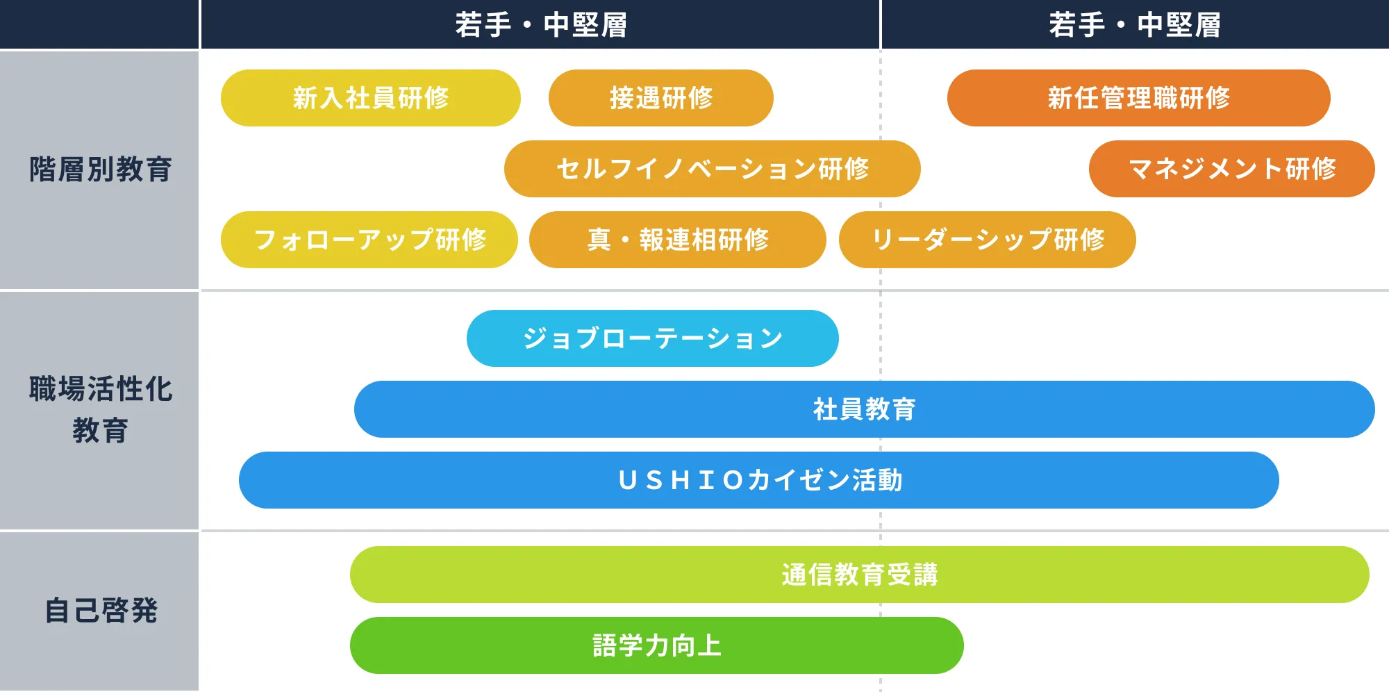 「社員の成長なくして、企業の成長はあり得ない」と当社は考え、様々な教育プログラムを備えています。階層別教育では、それぞれのポジションで必要とされる、考え方やスキルを身に付けていただきます。職場活性化教育では、社員の能力開発や企業力の底上げを目的としています。また、自ら学び成長する力を体得できるよう、各種通信教育などの自己啓発の支援も行っています。
